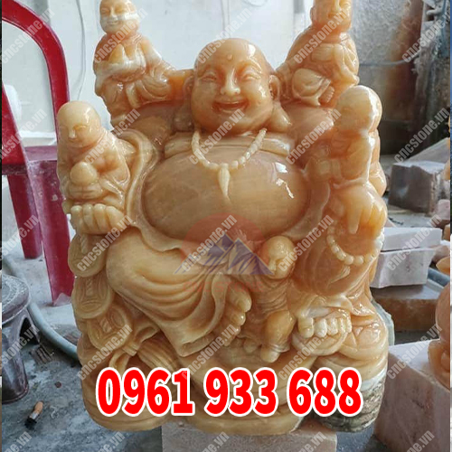 Tượng Di Lặc cùng trẻ em được các nghệ nhân của CNC Stone điêu khắc từ đá hoàng long nguyên khối với màu vàng ngọc tự nhiên đẹp mắt.