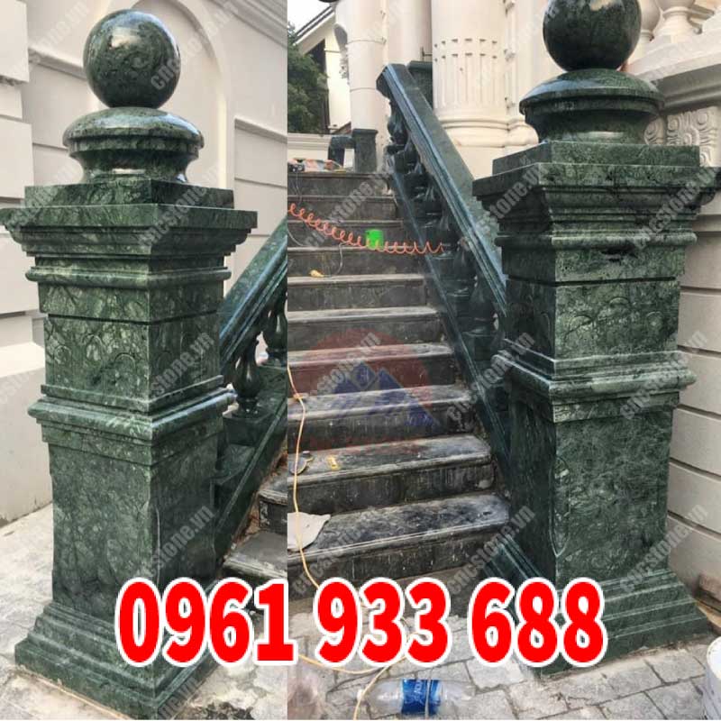 - Lan can đá được thiết kế đơn giản tinh tế, không có họa tiết cầu kì. Màu xanh ngọc là màu chủ đạo kết hợp với các đường vân trắng đá tự nhiên.