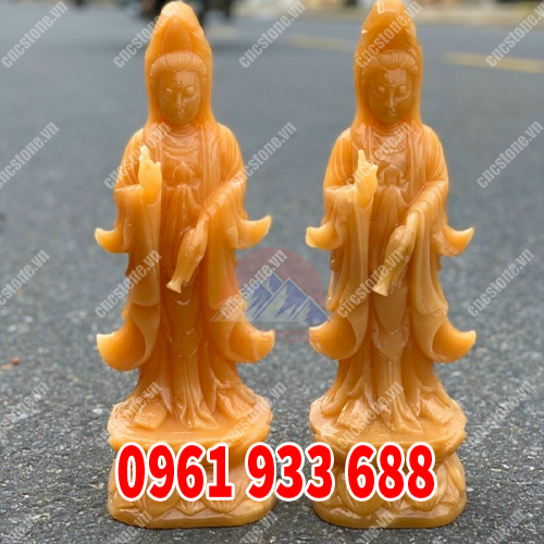 Cặp tượng Quan Âm được làm liền khối bằng đá ngọc hoàng long. Có đế tượng hình bông sen, phần trên là phần thân tượng đứng, tay trái cầm bình thanh tịnh, bên đựng nước cam lồ - ý nghĩa tượng trưng cho tâm từ bi của.